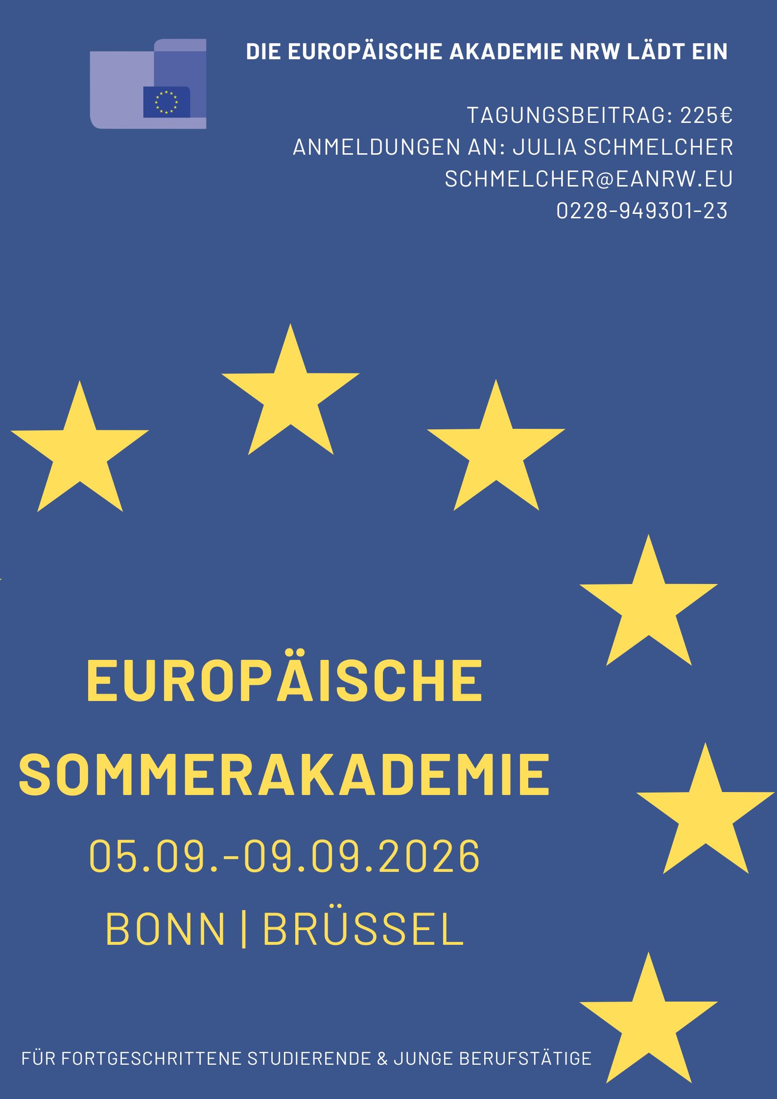 Die Europäische Akademie Nordrhein-Westfalen – eine anerkannte Bildungseinrichtung mit Sitz in Bonn – veranstaltet auch in diesem Jahr vom 05.09. – 09.09.2026 eine Europäische Sommerakademie. Unsere fünftägige Sommerakademie in Bonn und Brüssel richtet sich an fortgeschrittene Studierende und junge Berufstätige, die sich umfassend mit der Europäischen Union beschäftigen möchten. In einer interaktiven Lernumgebung vermitteln wir dir vertieftes Wissen über die politischen und historischen Grundlagen der Europäischen Union, schaffen einen Überblick über aktuelle Entwicklungen und geben Einblicke in die tägliche Arbeit der EU-Institutionen.